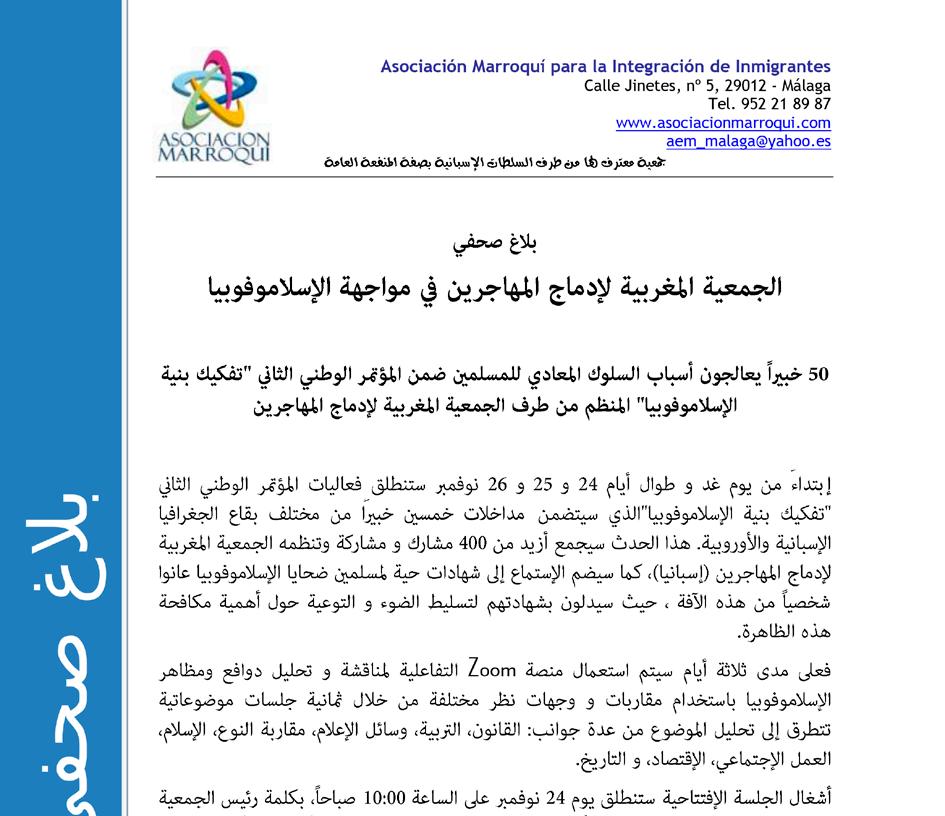 Por cuarto año consecutivo la Asociación Marroquí para la Integración de Inmigrantes celebró su Congreso Nacional “Desmontando la islamofobia”, enmarcado en el IV Programa Nacional de Prevención de la Islamofobia. Se planteó como un espacio de reflexión para todas aquellas personas interesadas en informarse, debatir, compartir y definir nuevas fórmulas y estrategias de contestación de la islamofobia. Se trató de un encuentro a nivel académico profesional cuya finalidad fue desmontar el discurso islamófobo desde diferentes ámbitos. En plena organización del Congreso, uno de sus conferenciantes, Mohamed Badaoui, fue encerrado en un Centro de Internamiento de Extranjeros, siendo víctima de islamofobia institucional. Por lo que Ahmed Khalifa, presidente de la Asociación, tuvo que entrevistar a su abogado, lo que desató cierta polémica en algunos medios de comunicación nacionales.