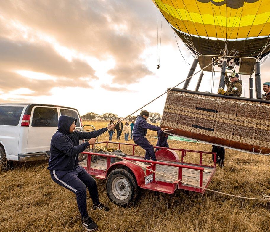 La experiencia comienza temprano, cerca de las cinco de la mañana, cuando las calles están desiertas y lo único que se escucha es el sonido de las tortillerías y de uno que otro gallo madrugador. Después de una breve introducción en el hangar de Vuela en Globo, el punto de reunión, una camioneta te lleva al campo de despegue; en un remolque detrás, se encuentra el globo plegado en una gran bolsa y la canastilla, sobre la que viajan cinco jóvenes ayudantes.