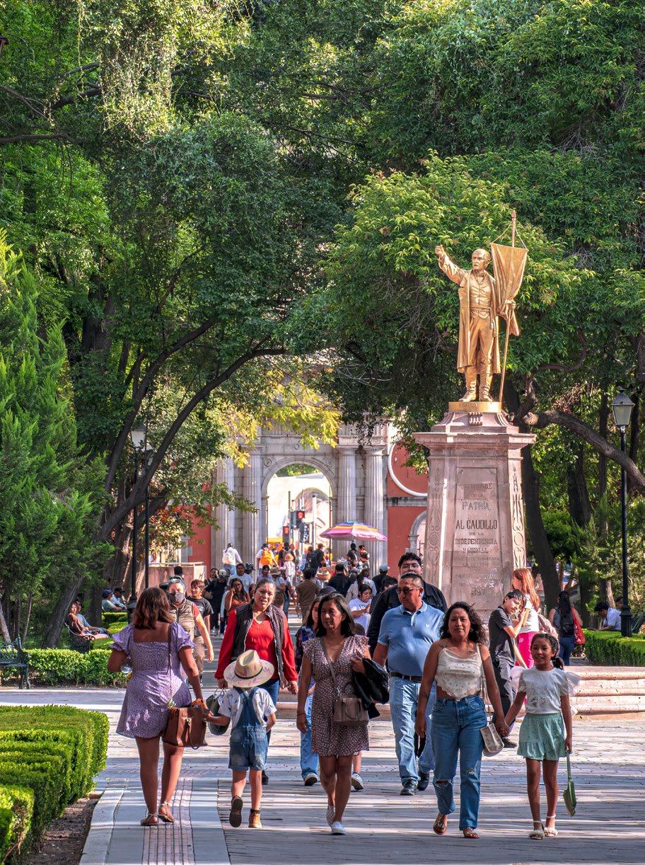 Miles de personas cruzan diariamente la Alameda Hidalgo pasando junto a la estatua de Miguel