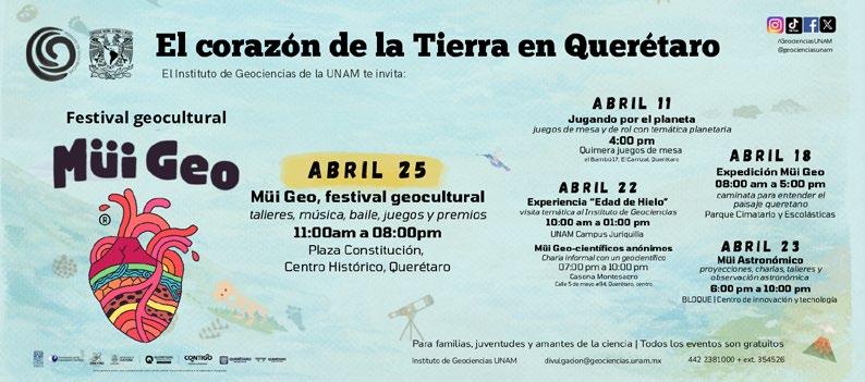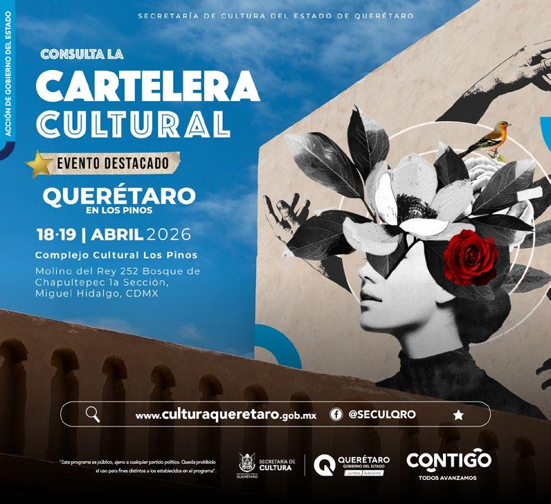 Publicación de contenido turístico y cultural del estado de Querétaro, revista mensual abril de 2026. Editor responsable ante la Secretaría de Turismo del Estado de Querétaro: Carlos de Jesús Ajís Castillo. Número de Certificado de Reserva otorgado por el Instituto Nacional de Derecho de Autor: 04-2023-091917100000-102. Número de Certificado de Licitud de Título y Contenido: 17623. Domicilio de la Publicación: Paseo de las Artes 1531-B, Col. Josefa Vergara C.P. 76090, Santiago de Querétaro, Querétaro, México. Imprenta: Talleres Gráficos del Poder Ejecutivo del Estado de Querétaro, Francisco I. Madero 68, Centro C.P.76000, Santiago de Querétaro, Querétaro, México. Distribuidor: RIO HILL CO., Virtudes 23, Col. Misión Mariana C.P.76903, Corregidora, Querétaro, México.