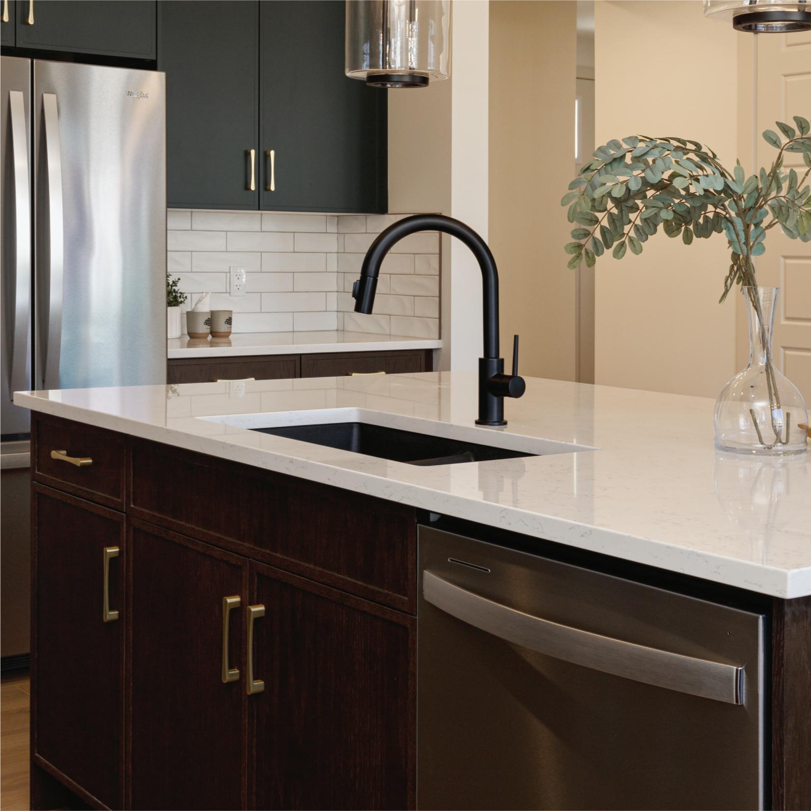 • Q u artz 3 cm c o u n t er t op s i n ki t c hen a n d mai n b a t h room - s i n gle fi n i sh fo r c o h e s i v e de s i gn .