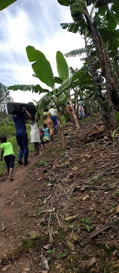 Qui il sacerdote direttore guida la salita dello staff … raggiungono un villaggio lontano per effettuare un collegamento di preghiera da trasmettere su Radio Maria Uganda!