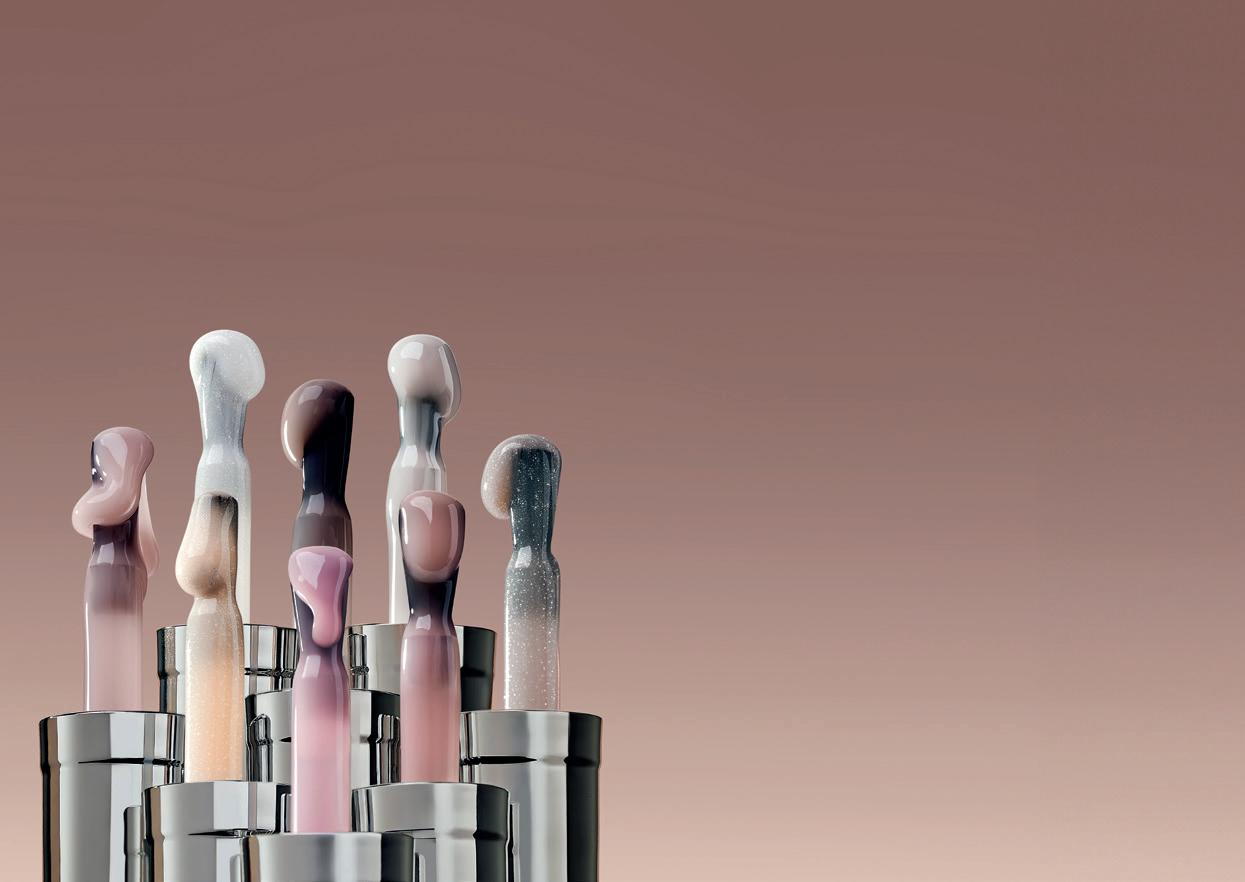 palette set against a grey backdrop, we sought to create an image of sophistication and refinement. By reversing the colour scheme to a pale grey on a pink background, we wanted to evoke a sense of balance and harmony, where simplicity meets strength. The deliberate choice of soft, delicate fabrics enhances the luxurious, tactile nature of the campaign, making the visual experience feel elevated.