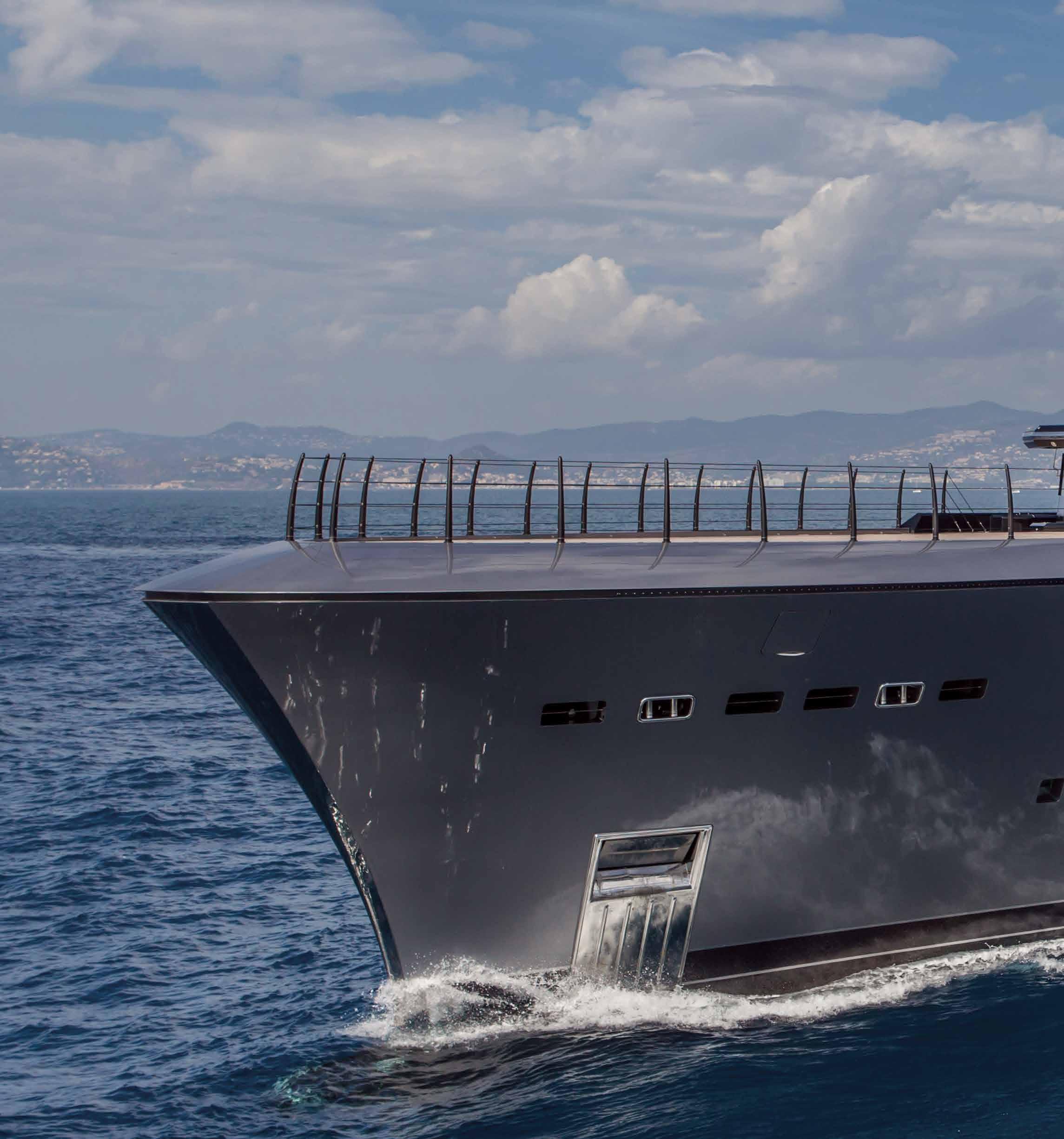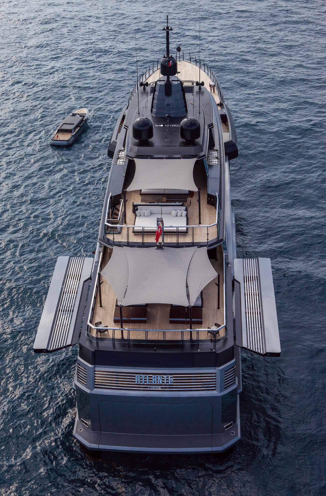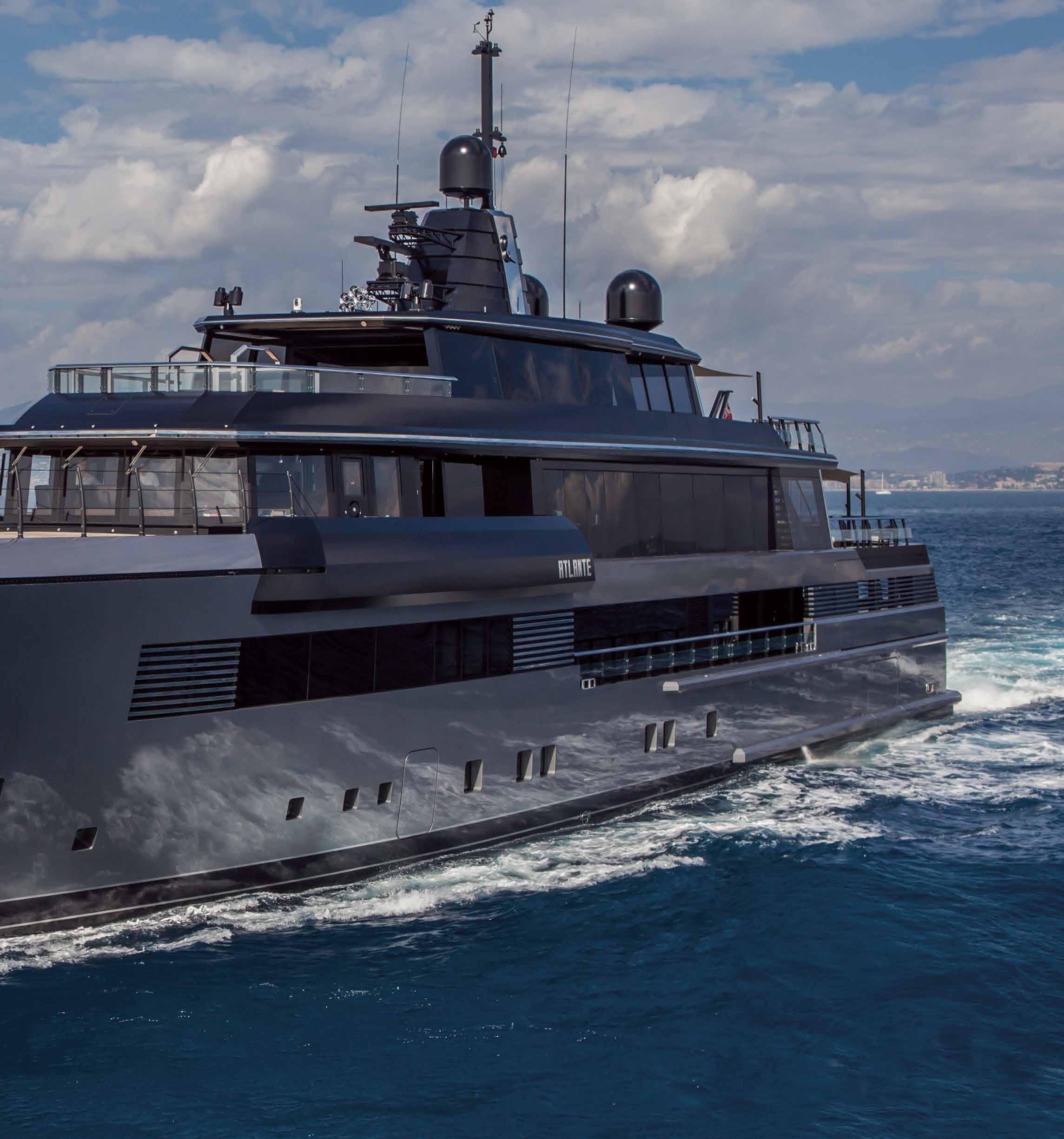 Dit indrukwekkende megajacht is 11 meter breed en heeft een sterke stilistische identiteit met een militair thema. Hoekige vormen, scherpe lijnen en innovatieve oplossingen werden gecombineerd met een zorgvuldig oog voor detail en maken van de Atlante een heel uniek schip.