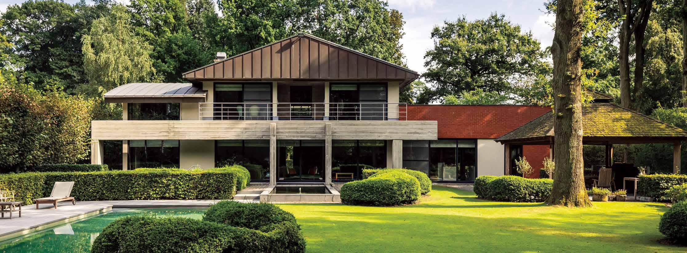 Post-modernistisch geïnspireede woning met een bew. opp. van 185 m² en omvat o.a. inkom, ruime living, 3 slpkrs, 2 bdkrs en een binnenzwembad.