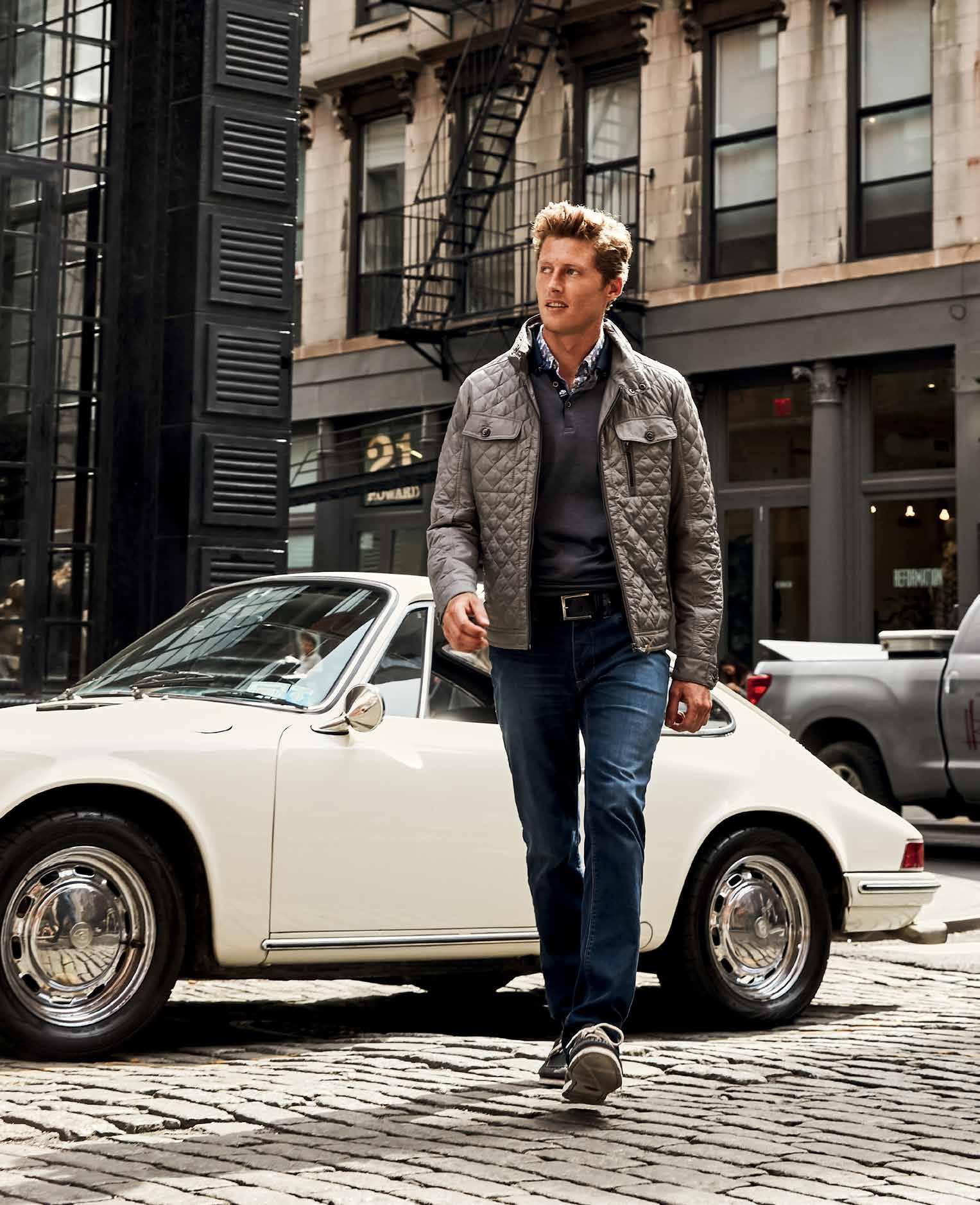 Klassiek gedetailleerd en gewatteerde donkerblauwe herenjas met rits- en knoopsluiting. Het jack heeft twee opgestikte zakken, beide met klep en snap met side inserts, en een binnenzak met snap. De kraag heeft een klink en een D-ring met drukknoop. Het Porsche schild is geborduurd op de linkerborst en op de linker bovenarm het ‘PORSCHE’ logo. Het Classic Porsche logo is geborduurd op de linker manchet. Een echte klassieker!