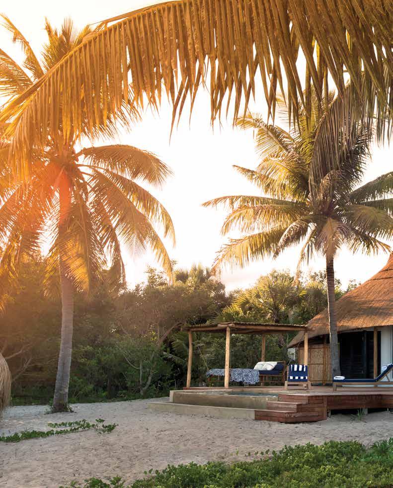 vulde minibars, prachtige stoffen en stijlvolle badkamers met buitendouche — maar ze vallen ook niet uit de toon op een relaxte plek als deze. (Laat ons zeggen dat alle schoeisel waar meer bij komt kijken dan bij je teenslippers je tas niet uit komt.) Elke cabinha en cabana heeft een eigen palapa op het strand, met een schommelbed voor twee.