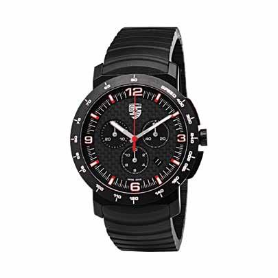 Klassiek sportief Porsche horloge met chronograaf uit de Sport Classic serie. Dit stoere, zwarte horloge met 13 ‘jewels’, heeft naast een tijds- en datumaanduiding ook een stopwatchfunctie met tussentijdsmeting en een tachymeter. Door het extra harde saffierglas met anti-reflectie coating en de Super-LumiNova wijzers, heeft u onbelemmerd zicht op de tijd. De zwarte kast is gemaakt van gehard aluminium, heeft een satijn finish en is waterdicht tot 50 meter. De zwarte band is van rubber en heeft een sluiting van roestvrij staal. Het ‘Porsche’ logo komt terug op de sluiting.