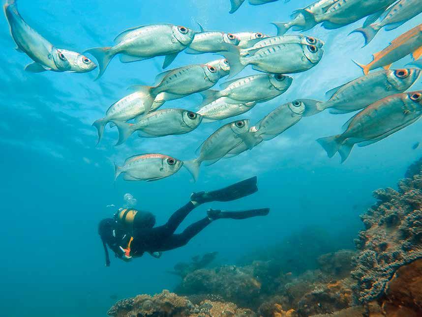 Je kunt hele dagen lang luieren aan het strand of deelnemen aan de waaier van activiteiten die het geweldige personeel organiseert. Ga bijvoorbeeld snorkelen aan het ongerepte Two Mile Reef, waar er een weelde aan gezond koraal is en het wemelt van de neusbultpapegaaivissen, vuurpijlvissen, Indische koraalduivels en andere kleurrijke koraalvissen. Er zijn catamarancruises naar Santa Carolina, een onbewoond eiland, ook Paradise Island genoemd, en waar de spookachtige ruïne staat van een ooit hip hotel. (Naar verluidt was Bob Dylan hier op bezoek toen hij zijn catchy nummer Mozambique schreef.) Met wat geluk kun je bij zonsondergang tijdens een van de cruises op een dhow, de Oost-Afrikaanse vissersboot bij uitstek, dolfijnen spotten of krijg je een enkele keer de zeldzame doejong te zien, een bijna uitgestorven zeezoogdier. Ook duiken is hier heel populair, maar hou er