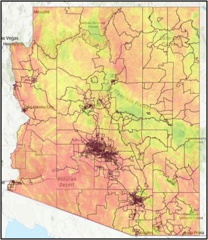 Arizona contains one of the fastest growing urban corridors in the US, including major cities of Tucson, Phoenix, and Flagstaff With many of the region’s urban areas routinely experiencing 30+ days of temperatures above 110 °F (43 °C) each summer, the population is stressed by the complex interactions of extreme heat, atmospheric pollutants, and limited water