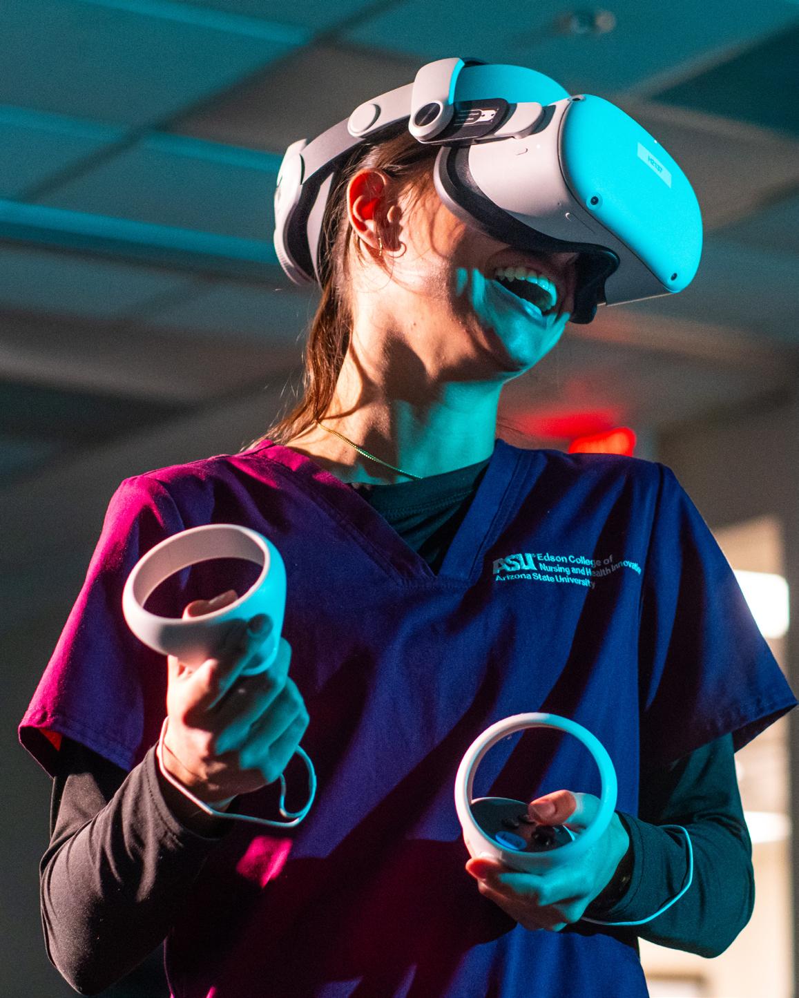 Nursing student Nancine Wemmer puts her training into practice in the Virtual Reality Simulation Lab, a new space developed by the College of Health Solutions and the Edson College of Nursing and Health Innovation.