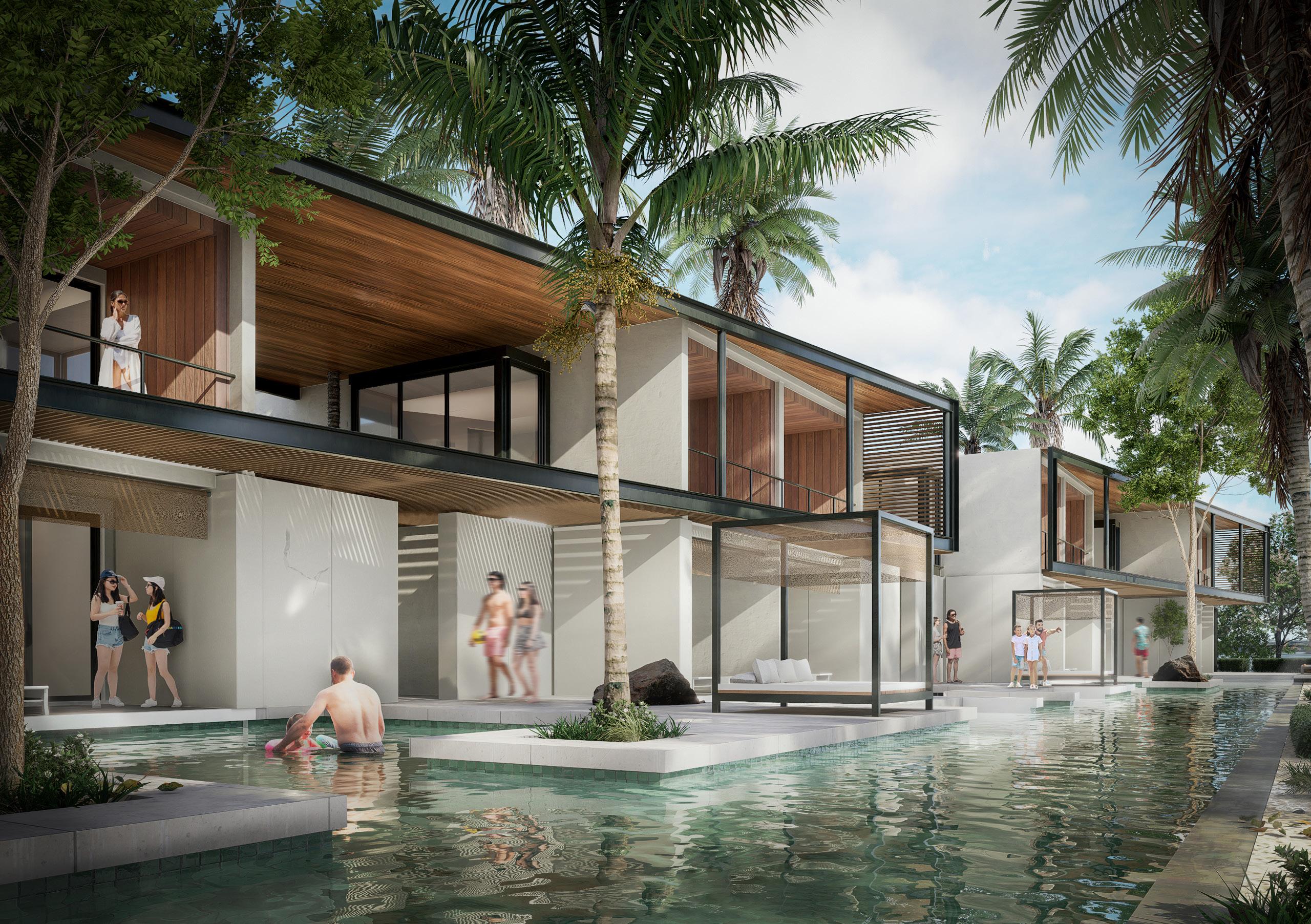 This contemporary resort design exemplifies the seamless integration of modern architecture with the serene beauty of a tropical environment. The open-plan layout features expansive glass facades and wooden accents, creating a balance of transparency and privacy. Centered around a flowing water feature, the design fosters relaxation and a connection to nature.