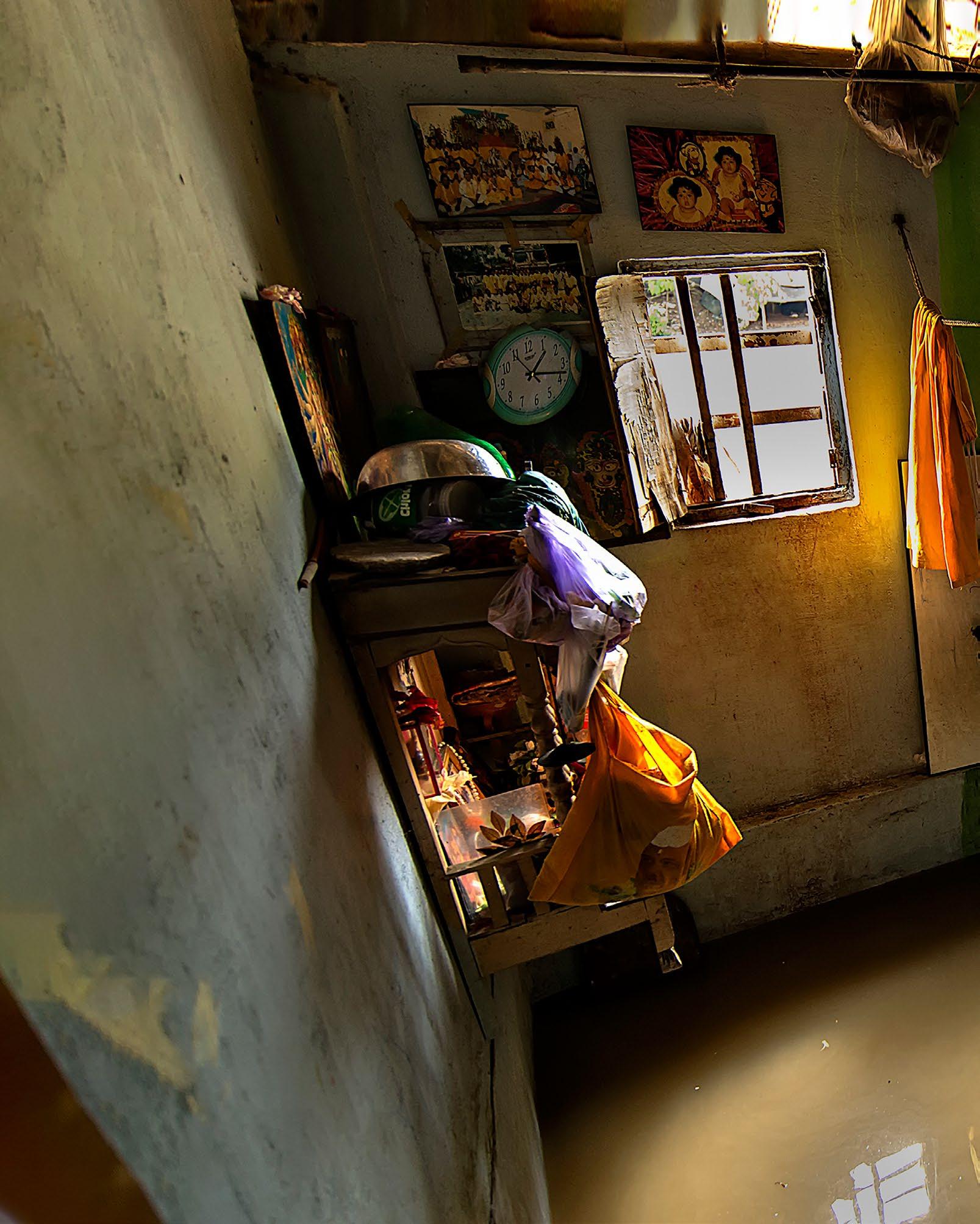 In recent years due to climate change, high tidewaters encroach upon and flow into homes such as this one in West Bengal, India. The effect of rising water levels not only causes residents to adjust how they live, it often causes climate migration.