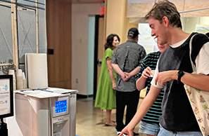 Visitors to the Arizona Water Innovation opening event experiencing water in varied ways ranging from virtual reality to sampling water from an atmospheric water harvester.