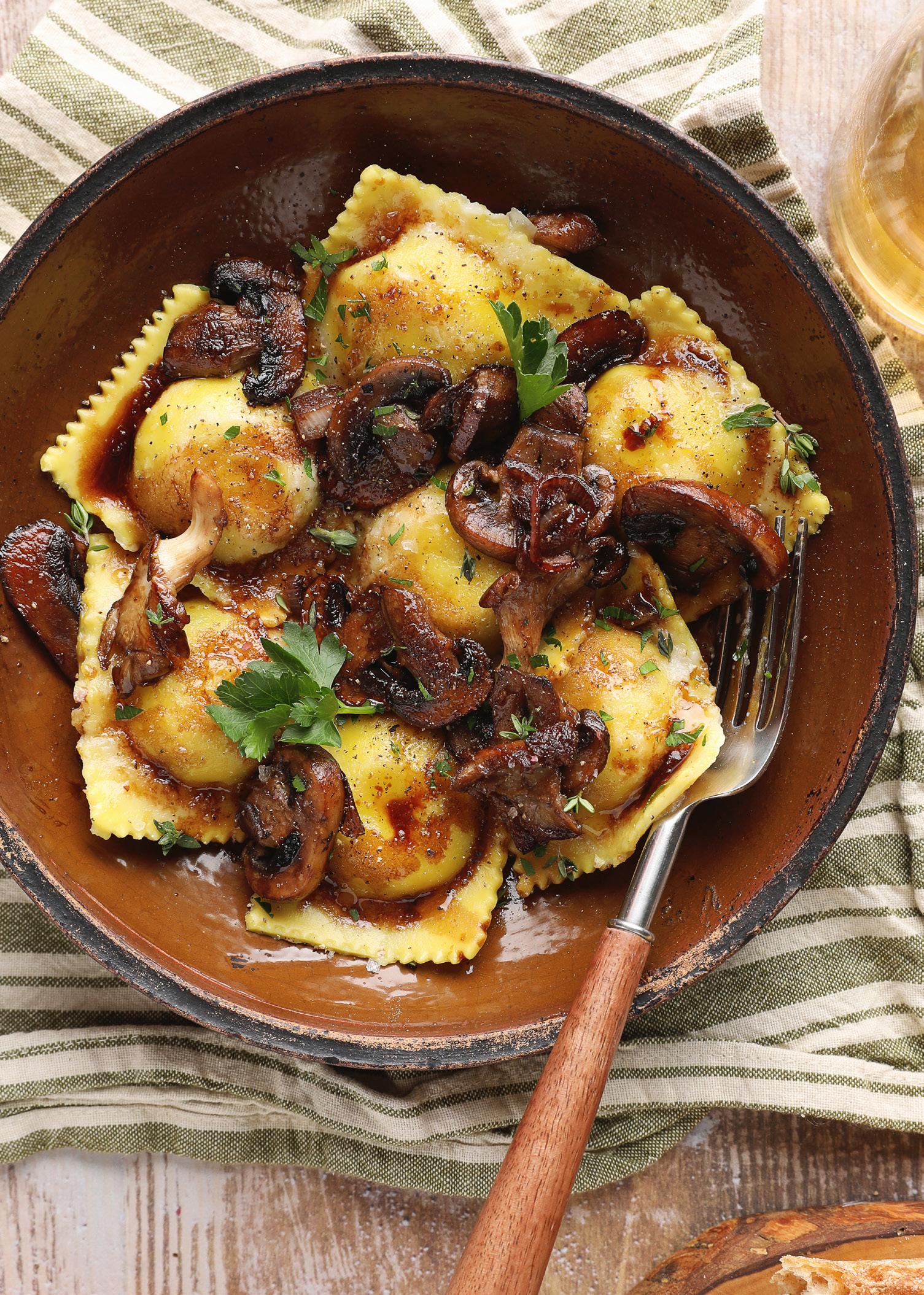 Bring a large stockpot of water to a rapid boil. Salt it. Cook the ravioli according to package directions (or 1 ½ – 2 minutes if homemade), until al dente. Drain and reserve ¼ cup of the pasta water. Heat a heavy-bottomed saucepan over medium heat and melt the olive oil and butter together. Add the garlic and cook for 30 seconds, keeping watch that it doesn’t burn. Add the shallot and cook for 2 minutes, stirring often. Add the mushrooms and thyme—season with a pinch of salt and pepper. Cook, stirring every few minutes, until browned (6 – 8 minutes).
