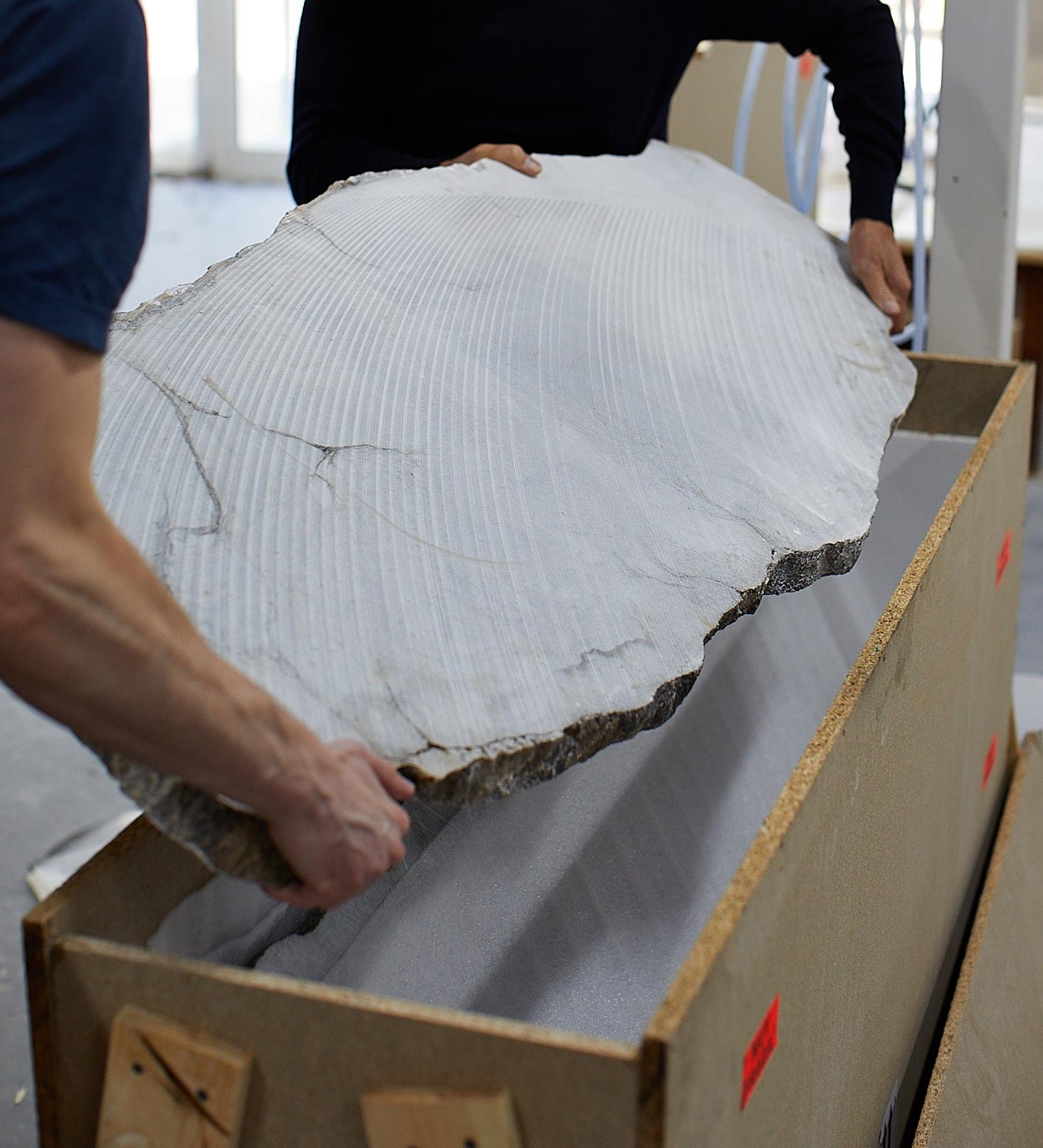 After identifying the alabaster blocks at the quarry, we receive slices of this unique stone directly from Spain.