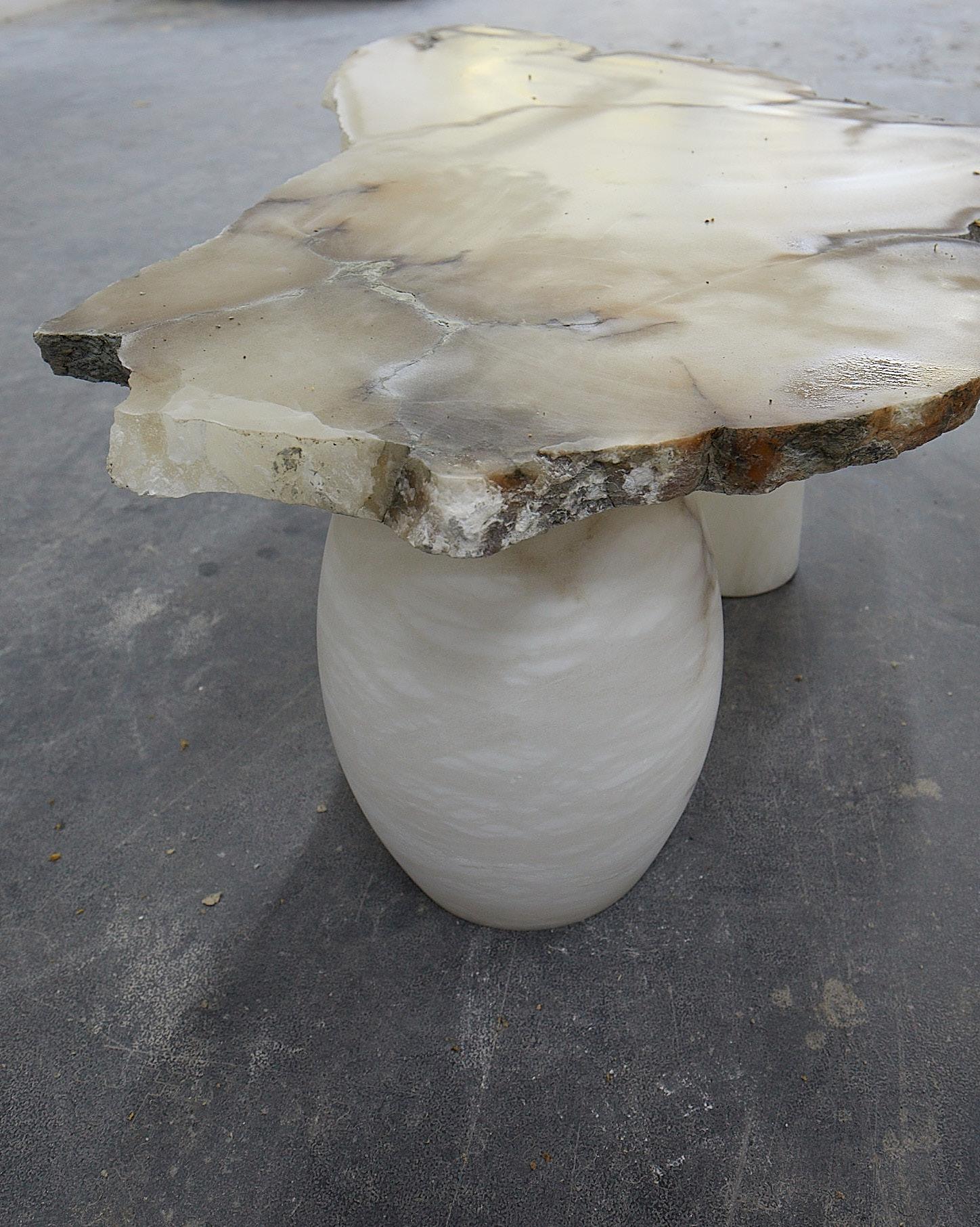 The bark of alabaster is precisely cut. The tabletop is then treated to guarantee the surface has optimal impermeability and resistance, thus ensuring exceptional durability.