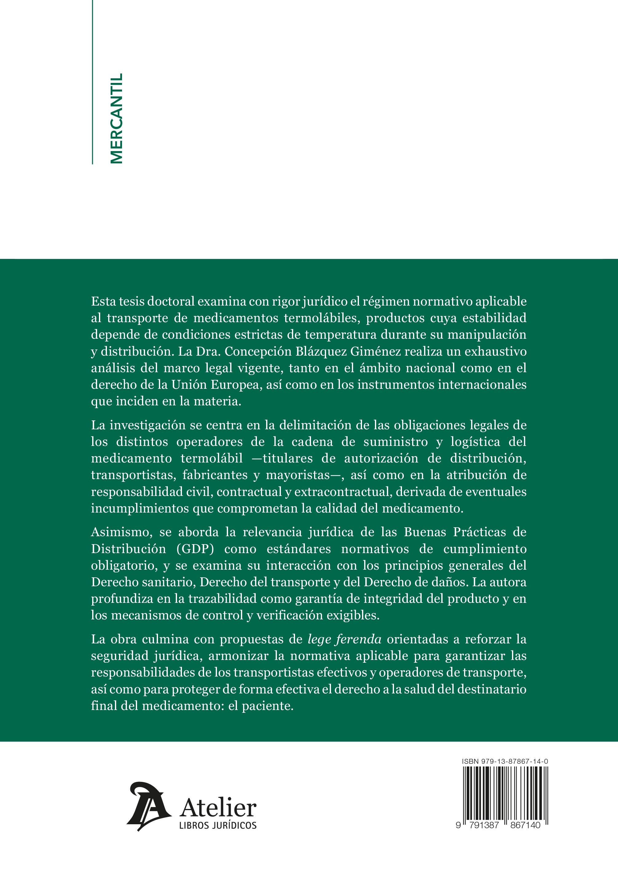 La investigación aborda un tema de vital importancia en el ámbito del derecho del transporte: El régimen jurídico del transporte de medicamentos termolábiles. Este estudio, realizado por Concepción Blázquez Giménez, ofrece una visión detallada y rigurosa de las normativas y regulaciones que rigen esta acti-