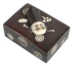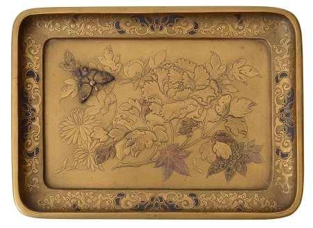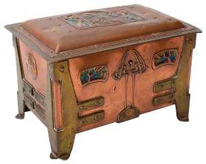 49. An Austrian Jugendstil Secessionist brass, copper and enamel jewellery casket of rectangular form with riveted corner bracket supports, embossed with stylised motifs and inset with coloured enamel panels to front and hinged lid, velvet lined interior, indistinct monogram to underside numbered 3, height 11.5cm length 17cm, depth 11cm £200-£300