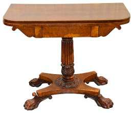 18. W A William IV rosewood card table circa 1830, the foldover top revealing a blue baize playing surface, the tapered column with a lotus leaf collar, on a quatreform base with scroll feet and castors, height 74cm, width 91cm, depth 45cm £150-£250