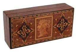 48. A 19th century Tunbridge Ware rosewood stamp box rectangular, the pull off micromosaic cover depicting the young head of Queen Victoria framed by stars and with geometric border, length 8cm £80-£120