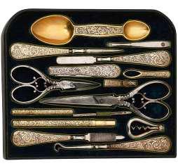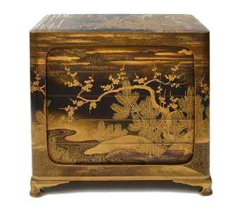 50. A Regency cream lacquered and gilt chinoiserie table top sewing cabinet the hinged top enclosing a fitted interior over a pair of doors enclosing three drawers with turned bone handles, height 21cm, width 25cm, depth 19.5cm £150-£250
