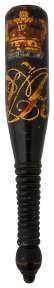 44. A Prince of Wales Investiture chair, 1969 in red stained ash, plywood and elm, designed by Anthony Armstrong-Jones, Carl Toms and John Pound, manufactured by Remploy, impressed to backrest in gilt with Prince of Wales feathers and motto ‘Ich Dien’, with upholstered seat cover in red wool mix fabric, stamped to underside, height 8.5cm, width 54cm, depth 48cm £300-£400