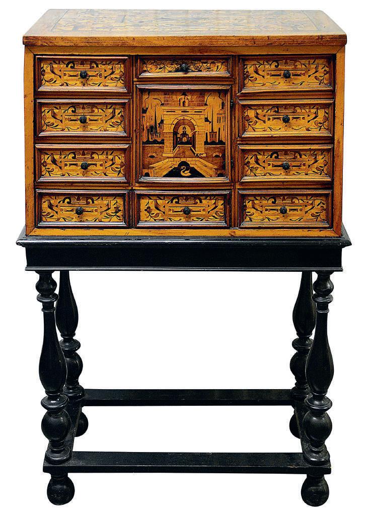 3. W A South German walnut and marquetry cabinet on stand circa 1600, the ebonised stand late 19th century, inlaid throughout with entwined strapwork, foliage and scroll motifs, the veneered sides and back with ebony and boxwood stringing, the central architectural inlaid door with an arch, tower and swan, the top with a central musical trophy motif including lutes, flutes and horns, the central door enclosed by nine drawers, the lower left drawer modelled as two drawers, height overall 115cm, cabinet height 43cm, width 68.5cm, depth 37cm £1,200-£1,800