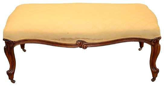 of serpentine outline and covered in foliate patterned fabric, on shell carved cabriole legs with brass castors, height 41cm, length 109cm, depth 64cm