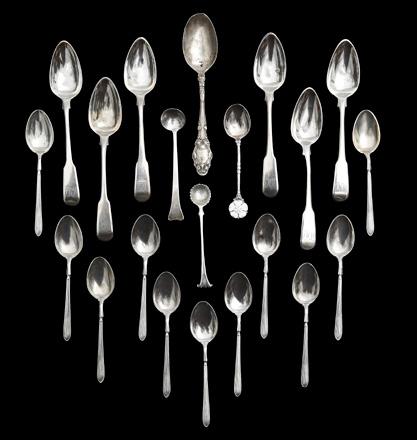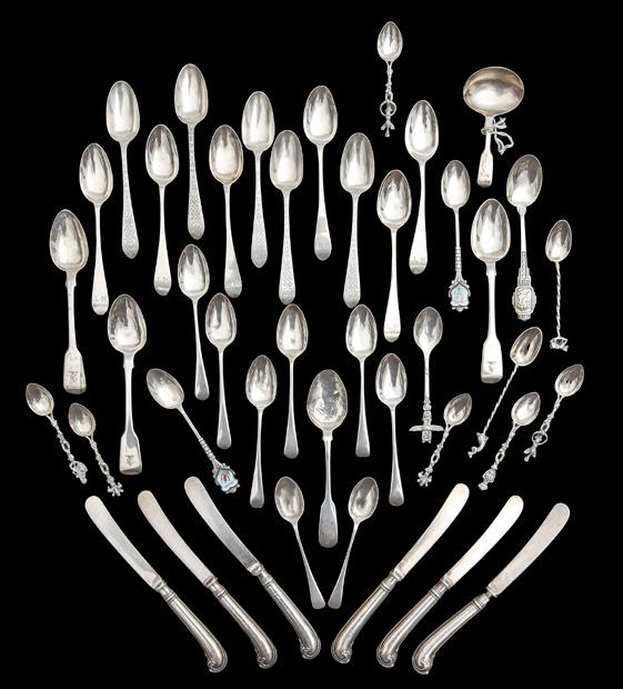 25. A set of silver cruets and two silver-plated napkin rings comprising a salt and mustard pot pair, by William Neale, Birmingham 1939, of octagonal form, and a pair of salts, by Deykin & Harrison, Birmingham 1903, with floral decoration, a collection of George III and later cruet spoons, and two silver-plated napkin rings including an example decorated with the Zodiac signs (qty.), the largest salt height 5cm, weighable 7.88ozt