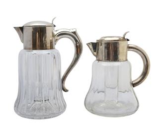 31. A German silver jug, two tea strainers, and an egg cup comprising a German silver mounted carafe jug, marked Hessenberg, crown and crescent moon mark, 800 standard, with a globular crystal glass body, an unmarked Continental tea strainer, decorated with figures within a garden, a Mappin & Webb tea strainer on stand, Birmingham 1943, raised on three hoof feet, and an egg cup, Birmingham 1926, engraved ‘Shirley’ (4), carafe jug height 13.5cm, weighable 6.32ozt