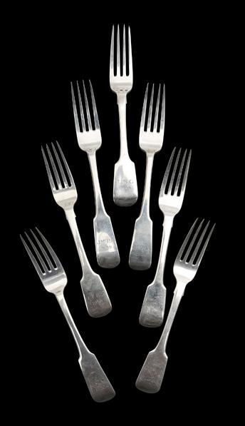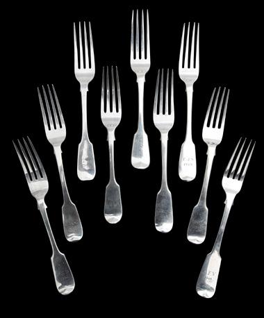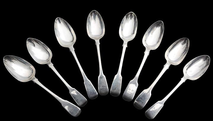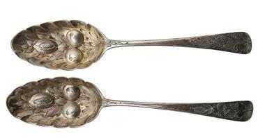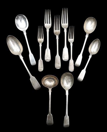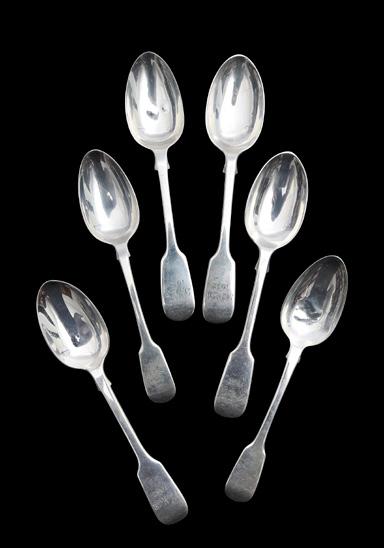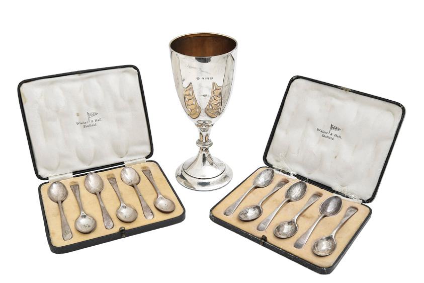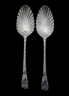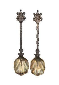 1. A pair of Worshipful Company of Salters silver spoons London 1858, with crest ended handles, and gilt bowls modelled as shells, the case with a paper label inscribed ‘Commemorative of the accession of the Salters Company to their Irish Estate, May 12th 1853, William Thomas Budding Ashley, Liveryman 1832’, length 14.5cm, weight 2.75ozt