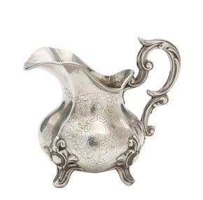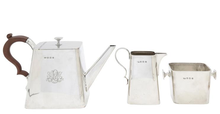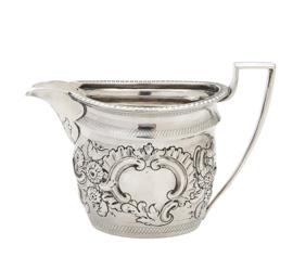 33. Two silver sauceboats, and a cream jug the sauceboats by Boardman, Glossop & Co Ltd, Birmingham 1905, raised on paw feet, and Viner’s, Sheffield 1962, the cream jug by Aaron Lufkin Dennison, Birmingham 1913 (3), the largest width 15cm, total 11.09ozt