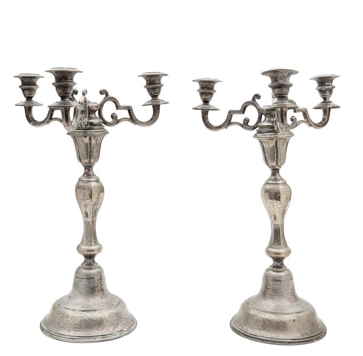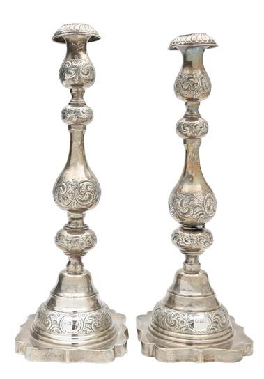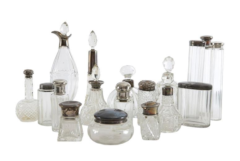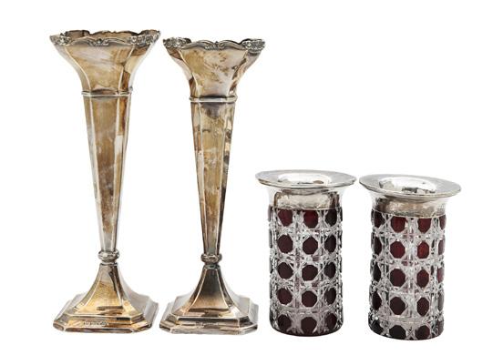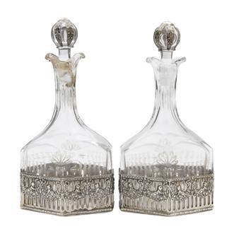 16. A pair of German silver mounted decanters late 19th century, by B. Neresheimer & Söhne, and Thomas Stapleton, London import 1927, the silver mounted stoppers leading to a slender neck, and acid etched hexagonal body, in a pierced silver mount decorated with Classical style garlands (2), width 12cm, height 25cm