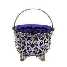 36. A Victorian silver swing-handled basket by George Richards, London 1857, with pierced foliate decoration, and a blue glass liner, diameter 12cm, height 8cm, weight 5.5ozt