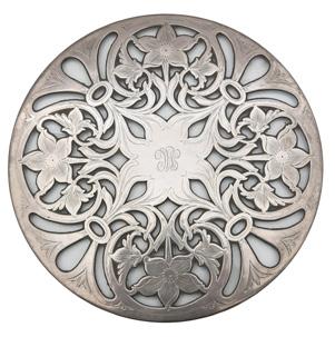 40. A Tiffany glass and silver mounted trivet tray late 19th century, marked ‘Made for Tiffany’, Sterling, 3092 10, the centre with engraved initials, leading to border of Art Nouveau daffodils, diameter 25.5cm