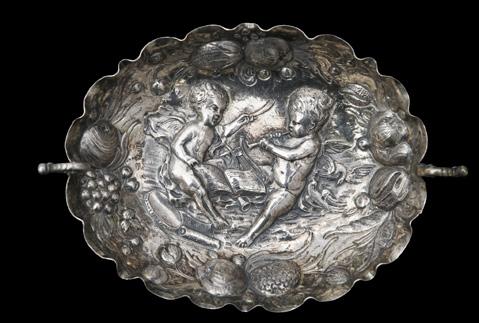 15. An 18th century silver twin-handled tray marked N X I3, possibly for Nuremberg, German, relief decorated with putti playing musical instruments, to a border of fruit, width 18cm, weight 4.66ozt