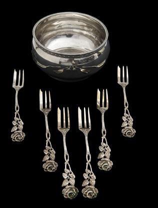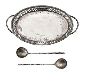 19. A Russian silver tray and a pair of teaspoons late 19th century, the oval tray, possibly Moscow, marked 84 to the feet, with twin-handles and a beaded and pierced rim, the spoons with A.C assay master mark, and A maker’s mark, 84 standard mark, Moscow, with niello work bowls (3), the tray width 19.5cm, total weight 6.56ozt £100-£150