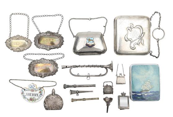 28. A collection of silver cruets and napkin rings comprising two Chinese silver napkin rings, with Chinese character marks, relief decorated with a four clawed dragon, another oval napkin ring, Birmingham 1924, and Chinese characters, an miniature vase, possibly Indian, marked to the base, with floral and foliate decoration, a tea stainer on stand, Birmingham 1987, a Victorian drum form mustard pot, a George III caddy spoon, an enamel souvenir spoon, two mother of pearl fruit knives, and another blue guilloché enamel (qty.), the vase height 7cm, weighable 7.87ozt