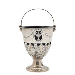 37. A Edward VII silver pedestal basket by Josiah Williams & Co, London 1901, with a swing-handled, beaded border, and Classical style decoration depicting pierced urns, and engraved swags, raised on an acanthus leaf pedestal base, diameter 9cm, height 11cm, weight 5.6ozt