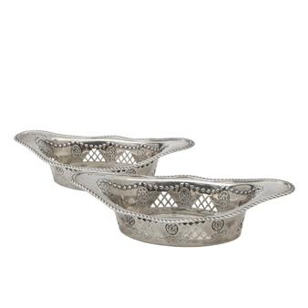 38. A pair of Edward VII silver bon bon dishes by Atkin Brothers, Sheffield 1904, of oval form, with a gadrooned rim, embossed with patera and swags, above pierced decoration (2), width 17.5cm, height 4cm, total 6.14ozt