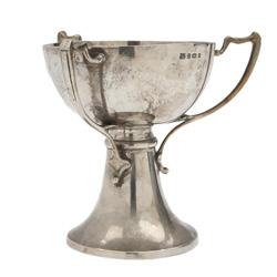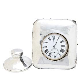 42. A pocket watch in a silver case and a silver inkwell the pocket watch stand by Rattray & Co, Birmingham 1912, and a silver mounted inkwell, by James Deakin & Sons, Chester 1917 (2), pocket watch stand width 10.5cm, height 11.5cm, inkwell diameter 7cm, height 4.5cm