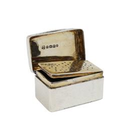 10. A silver nutmeg grater, two vinaigrettes, and a stamp box the nutmeg grater by TW, 19th century, engraved with a vacant shield cartouche, the two vinaigrettes including a gilt example in the form of a satchel, by John Shaw. Birmingham 1816, with a pierced foliate grille, a plain form example, maker TH, London 1779, and a stamp box, Birmingham 1902, in the form of an envelope, engraved with initials (4), nutmeg greater height 2.8cm, total weight 1.64ozt £150-£250