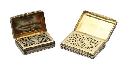 5. Two George IV silver vinaigrettes comprising a gilt example, by Ledsam, Val & Wheeler, Birmingham 1829, with its original sponge, and another by John Thropp, Birmingham 1824, both with engine-turned decoration, and gilt floral pierced grilles (2), width 3.5 and 4cm, weight 1.28ozt