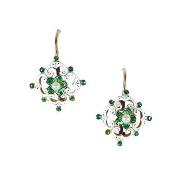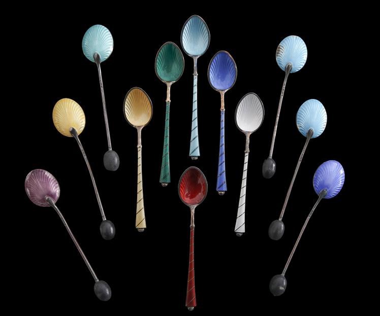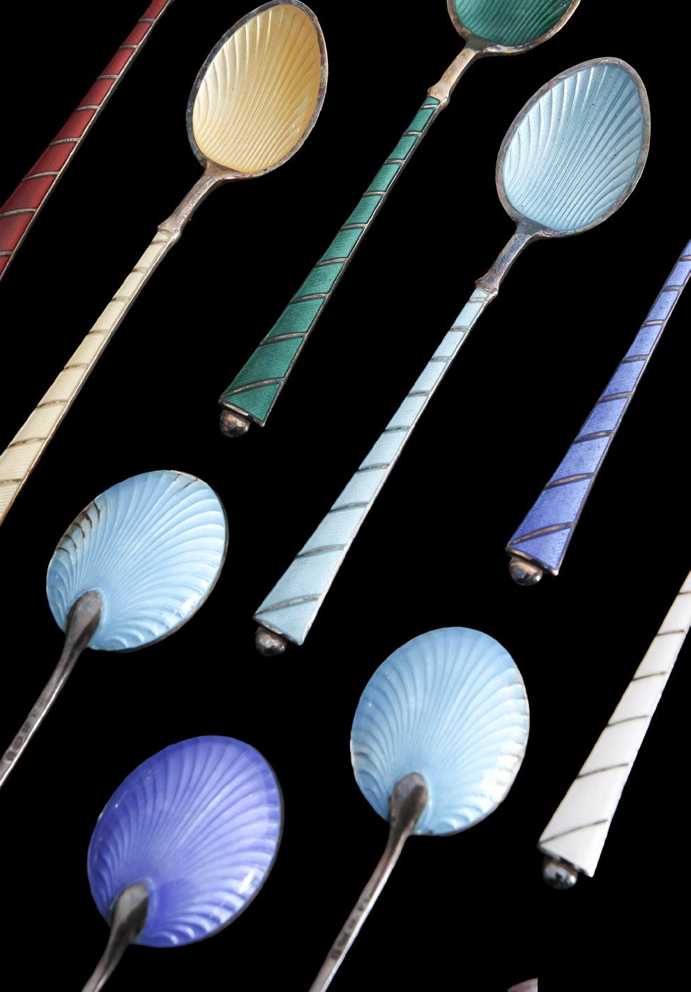 2. A David Andersen silver and guilloché enamel tea strainer early 20th century, Norwegian, marked 925, Birmingham import 1911, decorated with dark green guilloché enamel swags, width 12.5cm, 1.29ozt