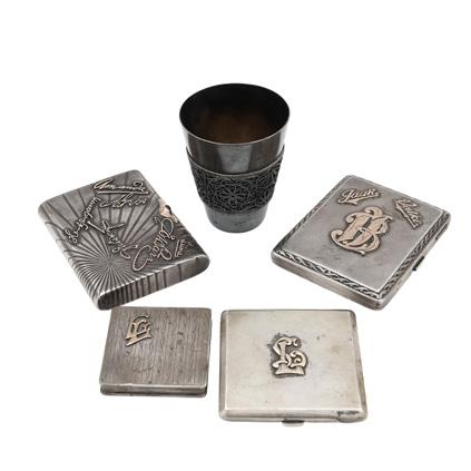 11. A George V silver compact, mirror, card case and trumps card stand the combination compact and sovereign holder by Mappin & Webb, Birmingham 1914, with engineturned decoration, the interior with an integral mirror and sovereign holder, the card case by Sharman Dermott Neill, Chester 1927, the small mirror mounted on a chain, and the trumps card stand, with rotating playing cards (4), the trumps card stand height 7.5cm, weighable 4.58ozt