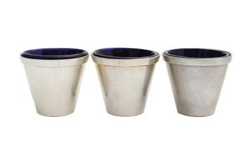 32. A set of three silver measuring cups by Nicholas Plummer, London 1998, of plain form, with blue glass liners (3), diameter 5.5cm, height 5cm, weight 4.91ozt
