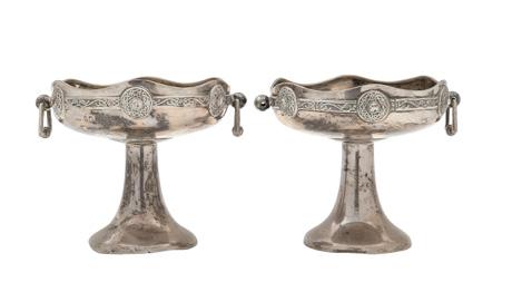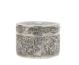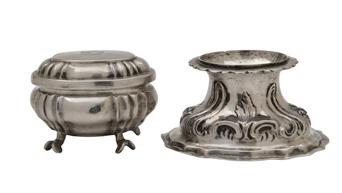 18. An 18th century silver trencher salt, and a box and cover the trencher salt, c.1780, with cross mark, possibly Flemish, Bruges, decorated with Rococo scrolls and flowers, and the box and cover, possibly German marked with a heart containing two stars above the letter S, and another pine cone above the letter i, the cover with an engraved crest (2), trencher salt height 5cm, box and cover height 6cm, total weight 5.25ozt