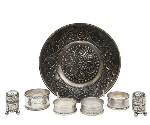 26. A silver bowl, four napkin rings and a pair of Victorian cruets the bowl marked 925, with repoussé foliate decoration, the napkin rings of circular form, Birmingham 1930, 1942, and 1945, the pair of cruets by Haseler & Bill, Birmingham 1890 (7), bowl diameter 17cm, the largest napkin ring diameter 5cm, cruet height 4cm