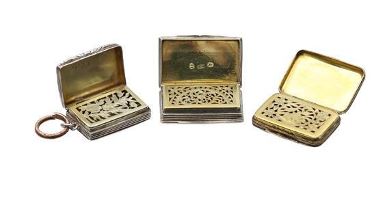 7. A group of three 18th and 19th century silver vinaigrettes comprising a George III example by Samuel Pemberton, Birmingham 1790, the grille decorated with a swan, a George IV example, by Thomas Spicer, Birmingham 1825, with a pierced floral grille, and a Victorian example by William Phillips, London 1839, with a pierced rose grille, all with engine-turned decoration, engraved initials and gilt interiors (3), width 3.3 - 3.6cm, total weight 2ozt